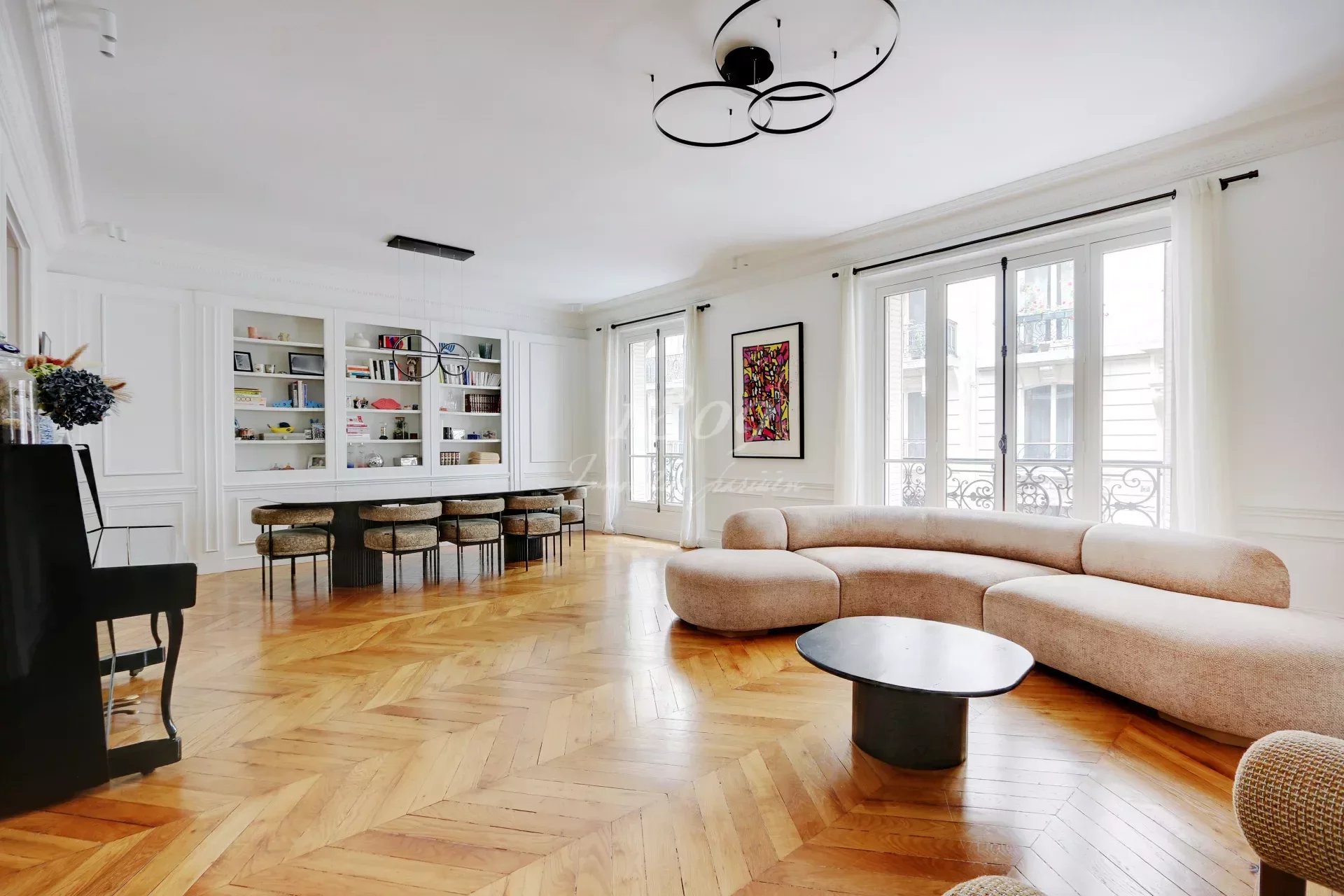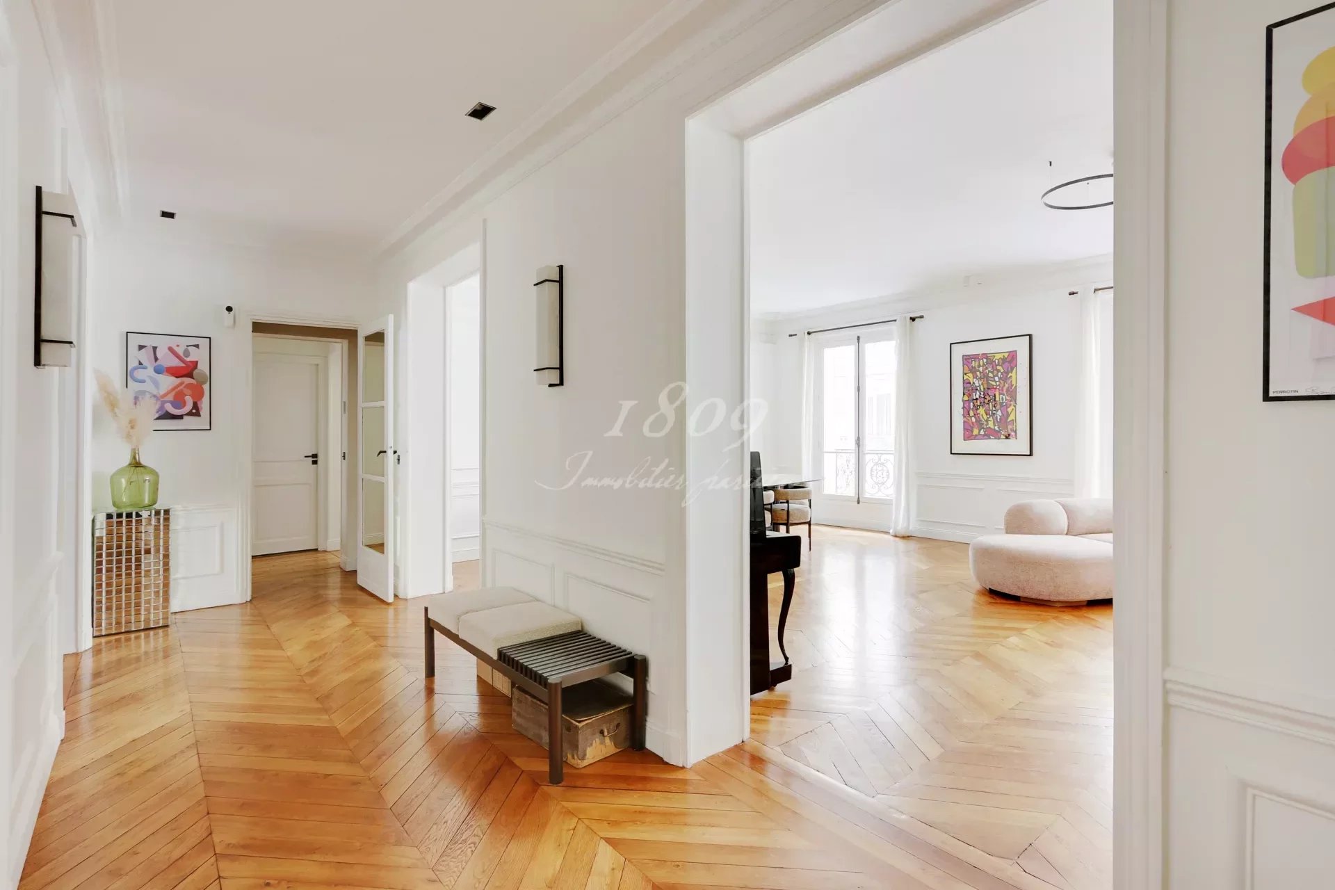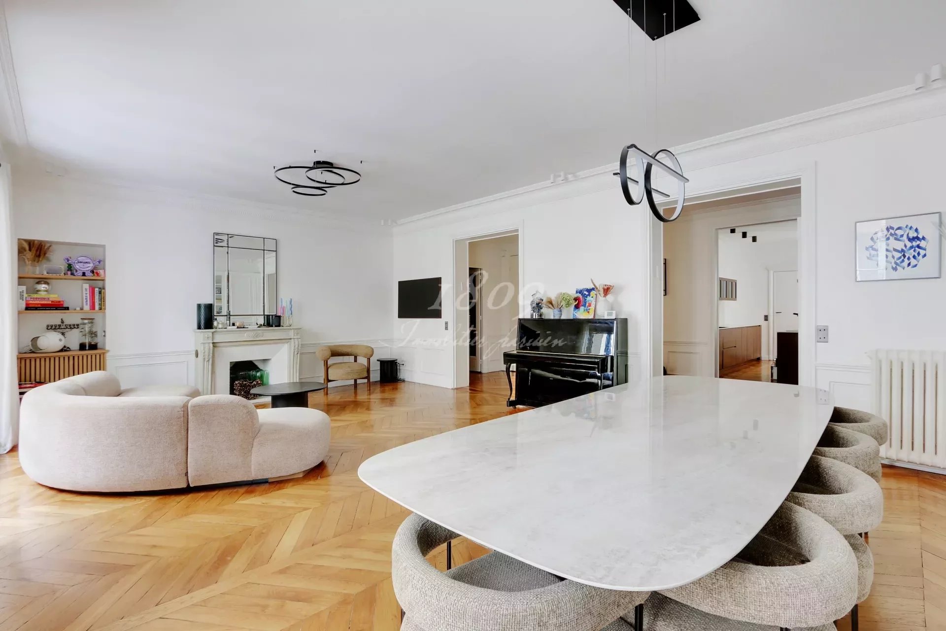 75016 Paris. We offer for sale in the immediate vicinity of Square Lamartine in a very beautiful old freestone building on the 1st floor by elevator, an elegant family apartment of 181.20 m2 Carrez law, completely renovated in a modern style.
